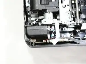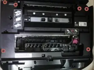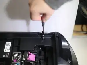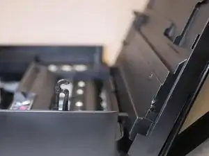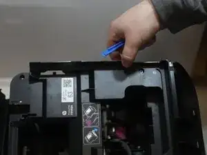 С помощью пластикового инструмента для открытия снимите зажим, удерживающий крышку сканера, поддев зажим от стороны сканера.