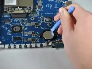 Вставьте кончик пластикового инструмента для открытия между аккумулятором и фиксирующей скобой. Вытяните аккумулятор, используя достаточный рычаг.