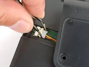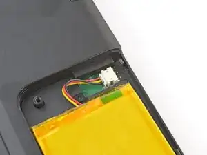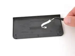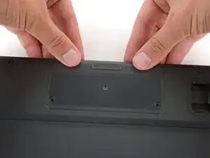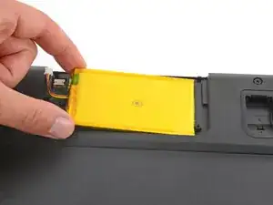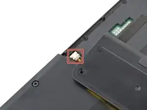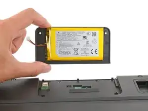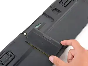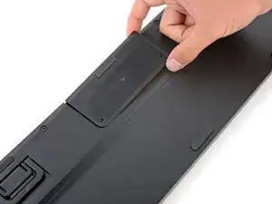 Положите новый аккумулятор в выемку в клавиатуре так, чтобы кабель находился у левого края, рядом с разъёмом аккумулятора.