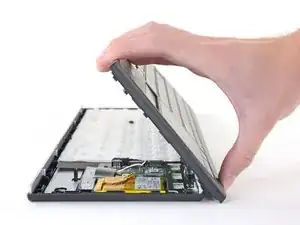 Верхняя крышка зафиксирована зажимами по периметру клавиатуры. На следующих шагах вы освободите зажимы с каждой стороны.