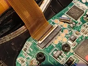 Отсоедините маленький гибкий кабель поверх большого гибкого кабеля. Просто поднимите бежевую фиксирующую планку вверх и вытяните кабель.