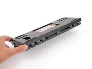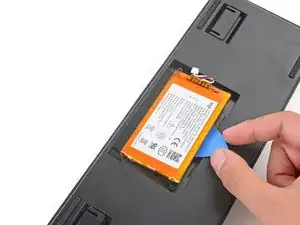 Подденьте нижний край аккумулятора лопаткой для вскрытия и аккуратно приподнимите, чтобы отделить клей, фиксирующий его в клавиатуре.