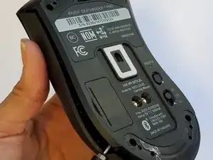 Переверните мышь так, чтобы надписи на дне были направлены вверх.