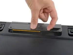 Осторожно сдвиньте крышку вправо, чтобы получить доступ к разъёму батареи в левой части выемки.