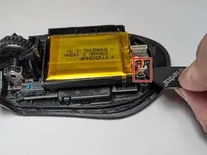 Используйте остриё лопатки или инструмент для вскрытия, чтобы поочерёдно нажимать на стороны разъёма батареи и «вывести» его из гнезда, отключив кабель батареи.