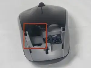Крышка отсека батареи находится на верхней части мыши. Шов, проходящий горизонтально по мыши, является верхней частью крышки.