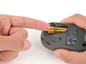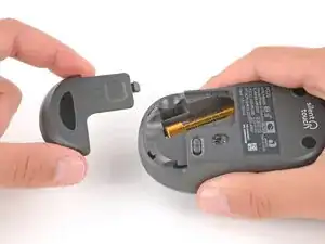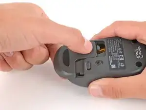 Нажмите на крышку батареи и сдвиньте её от мыши, чтобы снять.