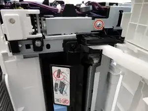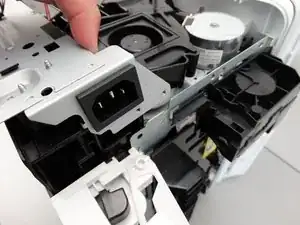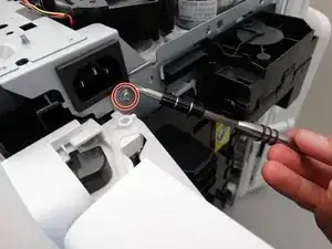 Удалите два винта Phillips #2 длиной 10 мм с левой (передней) и правой (задней) стороны, которые крепят блок питания к принтеру.