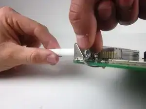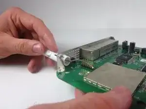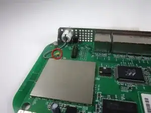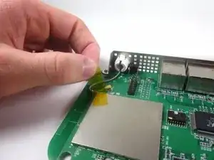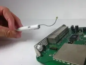 Используйте пинцет, чтобы аккуратно оттянуть металлическую скобу, соединяющую антенну с материнской платой.
