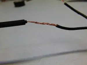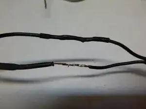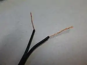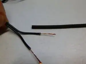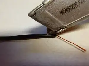 Разделите две половины каждого провода и разрежьте их канцелярским ножом. Не делайте это слишком глубоко! Вам нужно будет оставить пространство для укладки термоусадки перед пайкой.