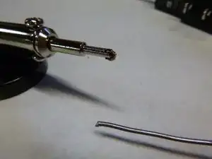 Теперь пайка. Поместите разогретый паяльник на провода на огнеупорной поверхности. Убедитесь, что термоусадка не приближена к паяльнику.