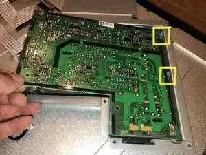 Переверните держатель платы питания, чтобы лучше видеть плату. Она закреплена четырьмя (4) винтами с крестообразной головкой.