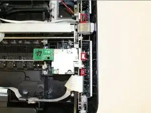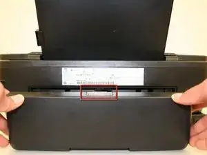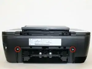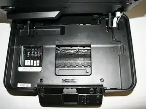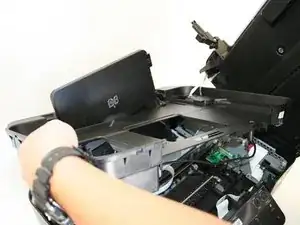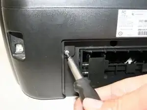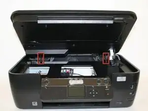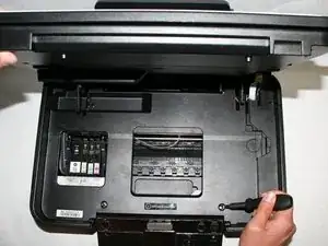 Открутите два винта Phillips №6 (головка 5 мм, размер 1 мм), соединяющих блок сканера с принтером.