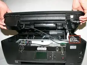 Медленно приподнимите, но не извлекайте пластиковую крышку вместе с блоком сканера, чтобы открылись три кабеля, соединяющих блок сканера с принтером.