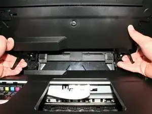 Одновременно плотно надавите на петли внутрь, к середине принтера, с обеих сторон. Петли должны легко подниматься и сниматься.