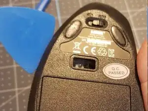 С помощью приспособления для поддевания снимите черные наклейки с нижней части мыши.