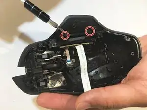 Используйте отвертку Phillips #00, чтобы открутить все 6 винтов (3x5мм) с нижней стороны ножек мыши.