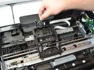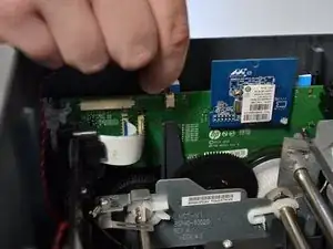 Ухватитесь за основание белого шлейфа, соединяющего крышку с основанием принтера, и вытяните его.