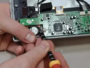 Один из винтов скрыт под чёрной лентой, поэтому аккуратно отодвиньте ленту в сторону, чтобы получить доступ. При установке платы поставьте ленту на место.