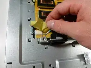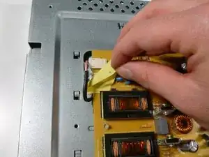 Снимите кабель дисплея, расположенный в верхней части платы, вытащив его вверх, в сторону верхней части монитора.