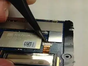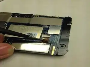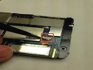 С помощью пинцета аккуратно вытащите кабель передачи данных дисплея из разъёма на плате.