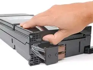 Нажмите на пластиковую защёлку и одновременно тяните сборку аккумуляторов, пока она полностью не выйдет из корпуса.
