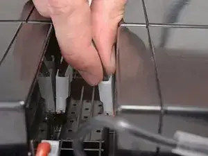 Поднимите светло‑красный провод с места рядом со стойкой винта, чтобы получить доступ к разъёму под ним.