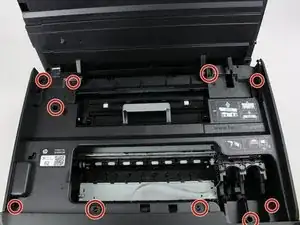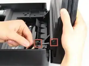 Извлеките внутреннюю пластиковую рамку (этот элемент можно снять после удаления десяти винтов по 12 мм, описанных в первом пункте), схватив рамку обеими руками и осторожно потянув её от корпуса принтера.
