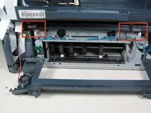 Вернувшись к задней части принтера, снимите сканер с задних петель.
