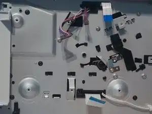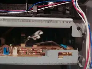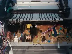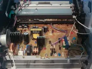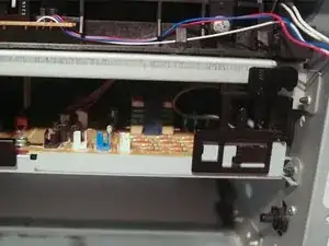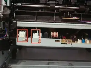 Согните шасси, чтобы плата управления освободилась, и отключите 2 кабеля от узла подачи бумаги.