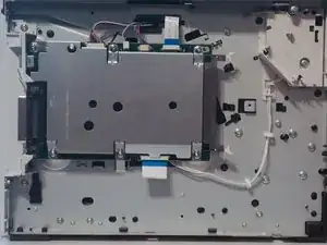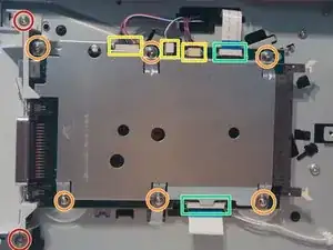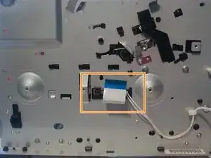 Отключите кабель, идущий к разъёму лотка, и пропустите его через отверстие в шасси.