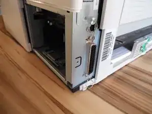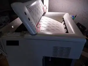 Для снятия боковой крышки необходимо открыть переднюю подачу бумаги. Кроме того, передний кассетный лоток следует вынуть, потянув его на себя, чтобы освободить один из защёлок.