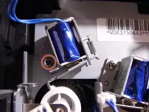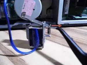 Используйте пинцет или зажимы, чтобы снять пружину, соединяющую металлическую вилку с защёлкой подачи.