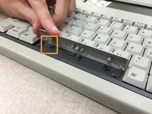 Если клавиша, которую вы снимаете, это пробел (как на изображении), вы должны найти одну пружину, расположенную на одном из двух круглых мест, находящихся с правой и левой стороны под клавишей.