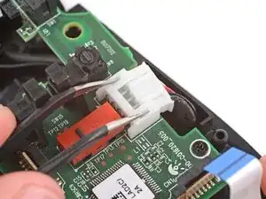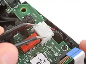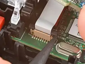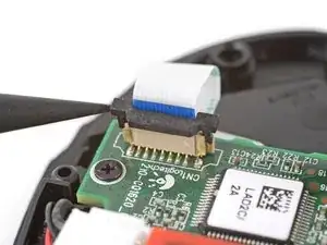 Вставьте каждую лапку пары изогнутого пинцета в вырезы по внешним краям разъёма кабеля мыши, расположенного возле края платы.