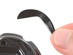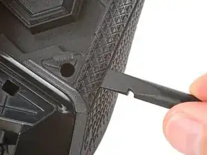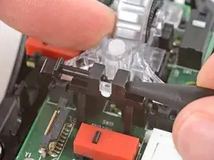 Используйте острие лопатки, чтобы выдавить и удалить фиксиральный штифт из пластиковой опоры колёсика прокрутки в центре платы.