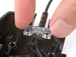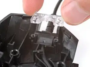 Снимите прозрачную пластиковую скобу кабеля с передней части мыши.