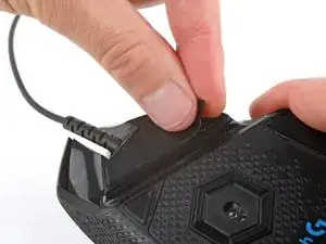 При сборке прокладите кабель в канавку и полностью вдавите резиновую прокладку в её нишу возле передней части мыши — вы должны почувствовать, как она встаёт на место.