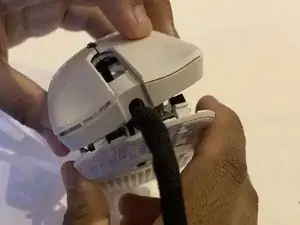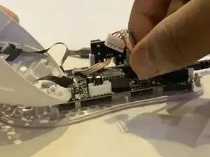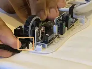 Сложите излишек кабеля и уложите его между белыми метками и печатной платой мыши.