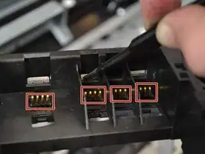 Четыре (4) разъёма должны легко выскочить. Если это не так, можно пинцетом выдавить их сверху.