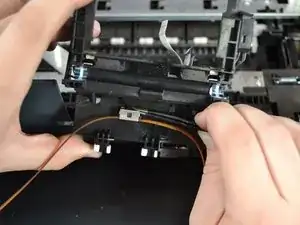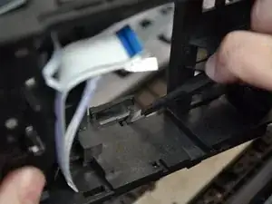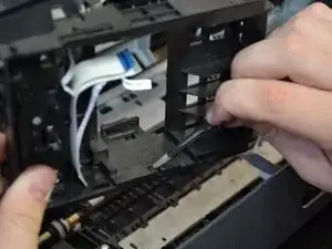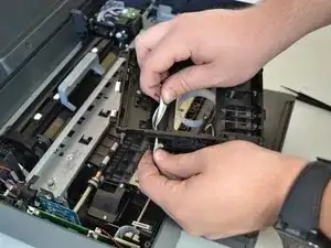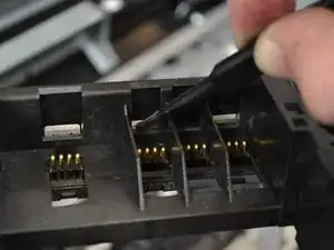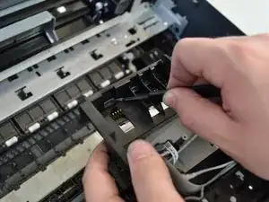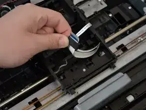 Снимите чёрный защёлк, вытащив ленточный кабель из каретки, потянув прямо вверх.