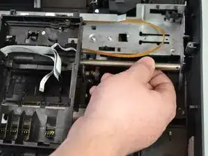 Освободите ремень каретки с крючка на другой стороне принтера пинцетом, потянув влево и вверх.