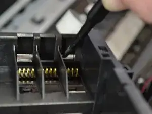 Пинцетом поочерёдно выдавливайте три защёлки из задней части каретки.