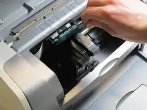 Поднимите переднюю панель, чтобы получить доступ внутрь устройства. После открытия передней панели принтер должен отреагировать, переместив печатающий картридж к центру устройства.