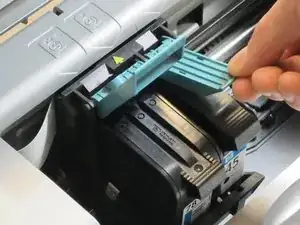 Поднимите оба пластиковых покрытия голубого цвета, расположенных сверху картриджей. Далее возьмитесь за выступ, находящийся сверху картриджей, и аккуратно извлеките оба картриджа из принтера.