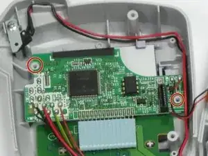 Используя отвертку Phillips размером #00, удалите два винта, обведённых красным, с зелёной платы.