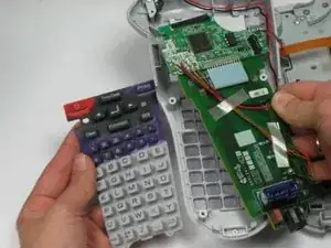Под зелёной платой вы найдёте резиновую клавиатуру. Снимите её и удалите из устройства.