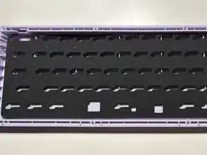 Поместите пластиковую и поролоновую прокладки на дно корпуса клавиатуры.