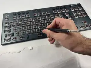 Используйте это руководство для удаления и замены ключа на клавиатуре Logitech G915 TKL. Ключ может потребовать замены, если он больше не регистрирует нажатия, и вы подтвердили, что проблема не в колпачке клавиши.
