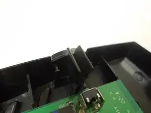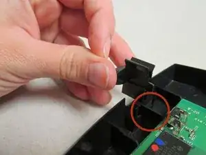 Осторожно опустите кнопку так, чтобы узкие зубцы кнопки resting на выемке (обозначенной красным) немного ниже отверстия в верхней части корпуса.